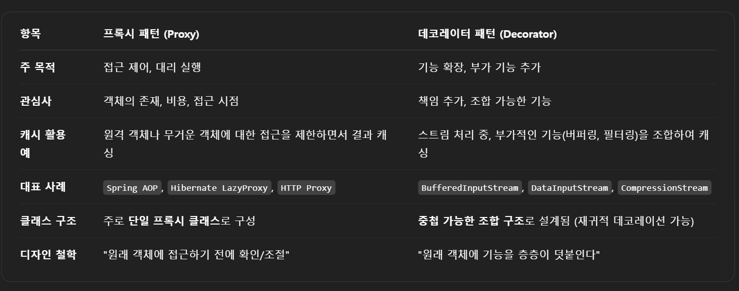 7.1 절에서 프록시 패턴을 통해 인터페이스에 캐싱을 추가할 수 있다고 이미 언급한 바있다. 이번 절에서는 데커레이터 패턴을 통해 inputstream 클래스에 캐시된 읽기 데이터 기능을 추가했다. 그렇다면 캐시를 추가해야 하는 경우 프록시 패턴과 데커레이터 패턴 중 어떤 것을 선택해야 할지 생각해보자