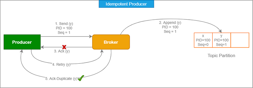 (단, 프로듀서마다 고유 PID가 할당되므로, 단일 프로듀서 세션 내에서만 멱등성을 보장할 수 있다)