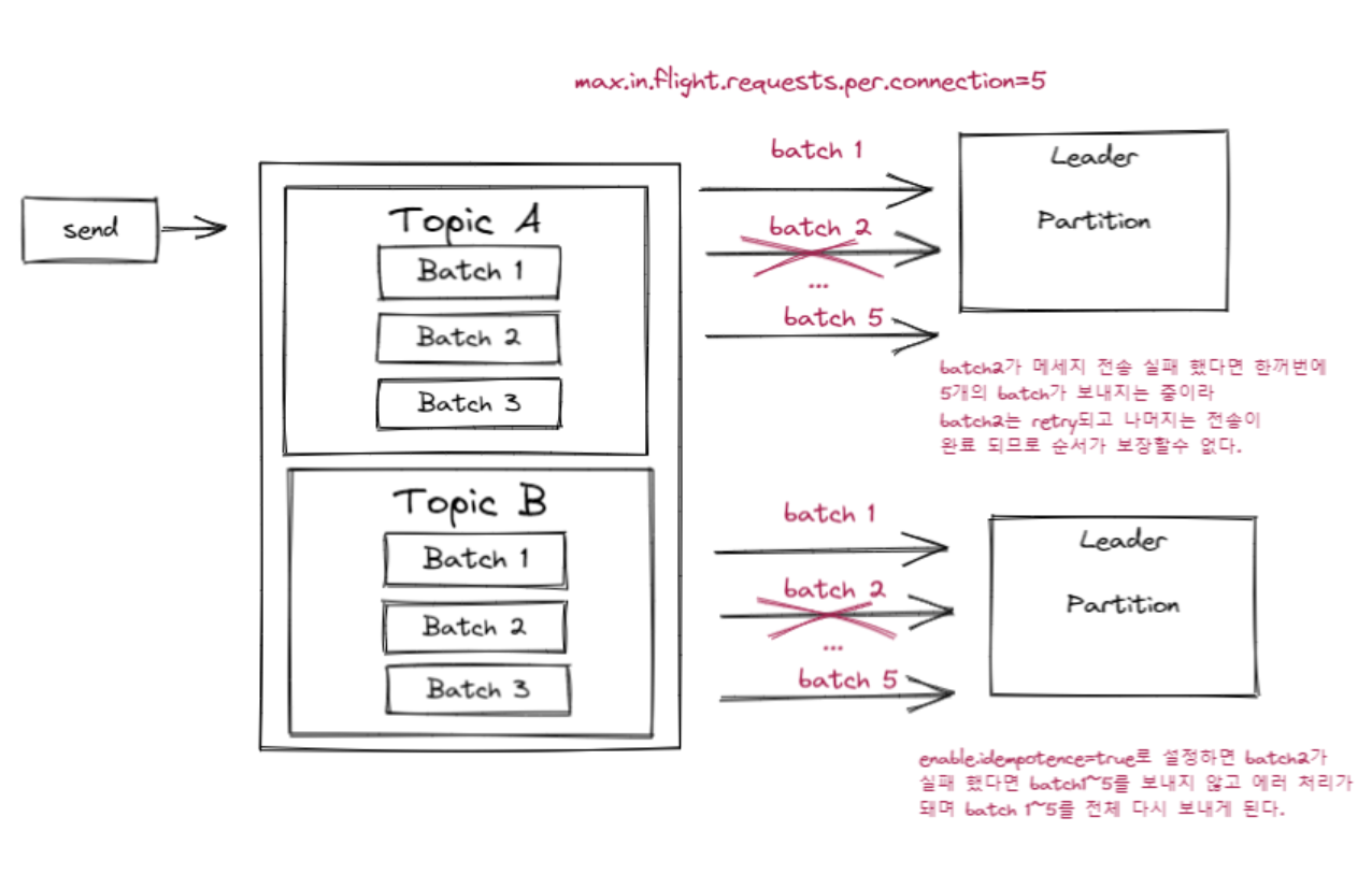 카프카의 멱등 프로듀서는 같은 파티션에 대해 메시지의 순서를 보장해야 한다. 이 값이 5 이하일 때, 프로듀서에서 한 메시지가 실패하면 그 후의 메시지들은 서버에 전송되지 않는다. 이러한 동작은 메시지의 순서가 변경되지 않도록 보장하는 데 중요하다.