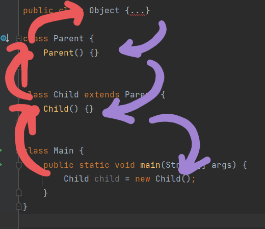 결국 모든 클래스들은 Object를 상속받고 있는 구조인 Java에서 모든 클래스의 객체를 만들 때 해당 클래스의 상위 클래스들의 생성자를 모두 거쳐 Object 객체가 생성됩니다.