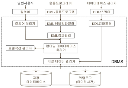 - run-time database processor : 저장 데이터 관리자를 통해 데이터베이스에 접근하여, DML 컴파일러로부터 전달받은 데이터 처리 요구를 실제로 실행