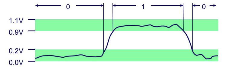 비트는 특정 구간대의 전기 신호만 해당 신호로 받아들이고 0.2V ~ 0.9V 사이의 전압은 신호로 받아들이지 않아서 노이즈 등에 영향을 받지 않을 수 있다.